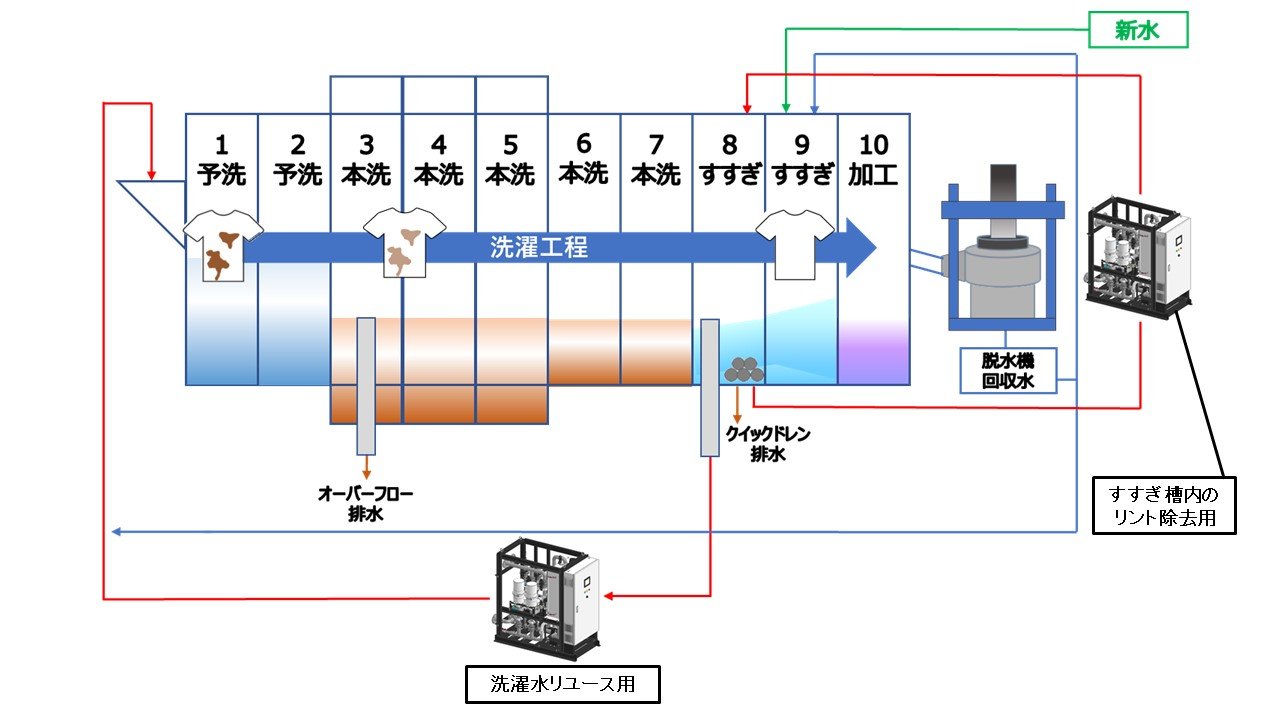 本製品は、自動逆洗機能を有したディスクフィルタ※1を用いてろ過処理を行います。本洗やすすぎ水からのリント※2等の懸濁物質を除去し、リサイクルに適した水に改善、予洗水に利用します。さらに、この製品を利用したシステムでは、脱水機からの回収水の一部を連続式洗濯機のすすぎ水に再利用することで、すすぎ水の新水補給量を削減します。