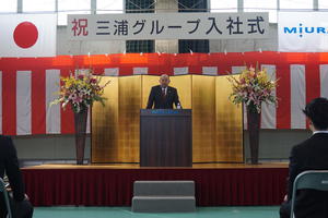 入社式には、社長をはじめ、執行役員や統括部長などが出席し、新入社員を歓迎しました。社長の宮内は、「限られた時間を有効に使って価値を生み出す努力と、相手を思いやりながら"愛"のあるコミュニケーションがとれる"ミウラ人"になってほしい」とエールを送りました。
