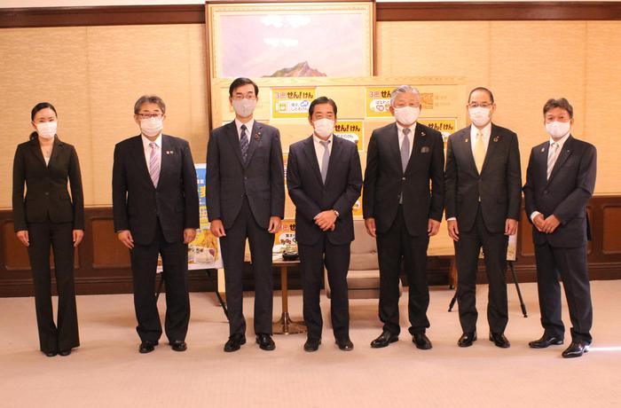 (左から順に)全国農業協同組合連合会 料理研究家 山瀬 理恵子 氏 / 愛媛県信用農業協同組合連合会 代表理事理事長 井関 正志 氏 / 株式会社伊予銀行 常務取締役 山本 憲世 氏 / 愛媛県知事 中村 時広 氏 / 三浦工業株式会社 取締役会長 高橋 祐二 / 株式会社愛媛銀行 常務取締役 豊田 将光 氏 / 全国農業協同組合連合会 愛媛県本部長 関岡 光昭 氏