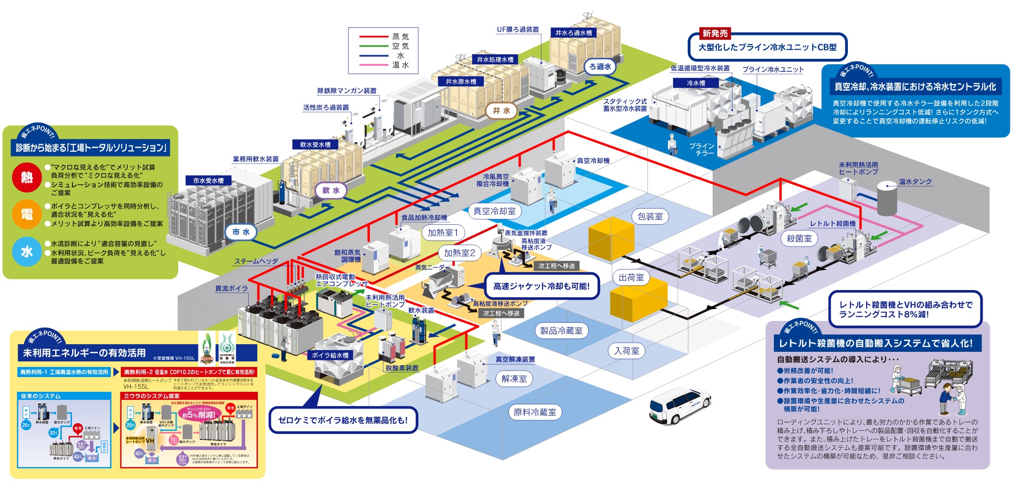ミウラの食品機器は様々な食品加工場や、冷却施設などで使用されております。お客様にとって最適な製品をご提供し、美味しく安全な食品づくりに役立つシステムをご提案しています。